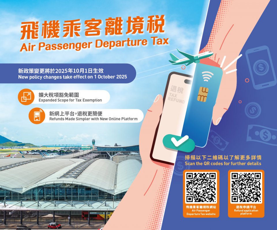 The Airport Authority Hong Kong will launch a new Refund Application Platform for the air passenger departure tax (APDT) on 1 October 2025. Eligible passengers who have paid the APDT at the time of purchasing the air tickets may easily apply for tax refunds by simply uploading supporting documents to the platform. For more details, please visit the website www.APDTrefund.hk.